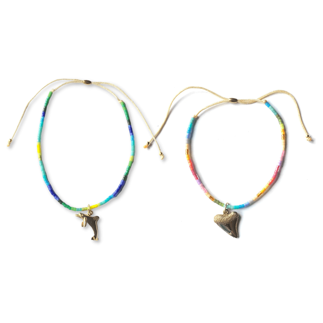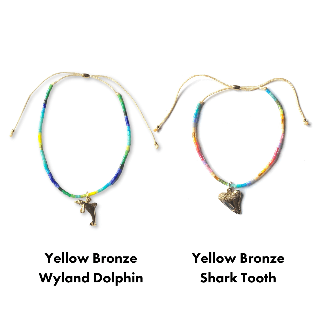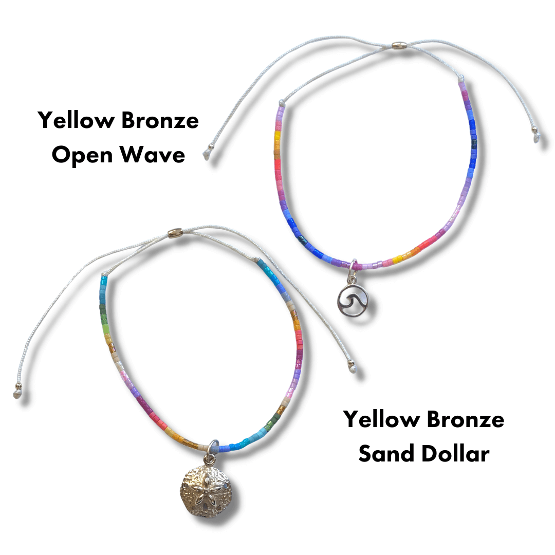 The Yellow Bronze charms are hand made in Anaheim, CA. The shark tooth bronze is made in Thailand. The sand dollar and open wave charms were made in Indonesia. The charms are attached to the glass bead bracelets with 14K gold filled jump rings.