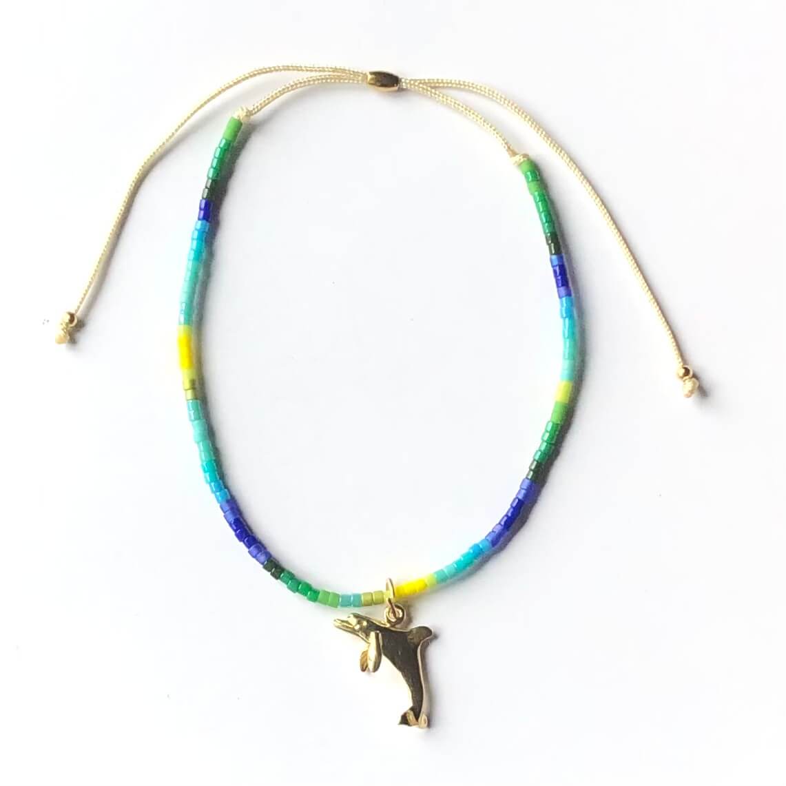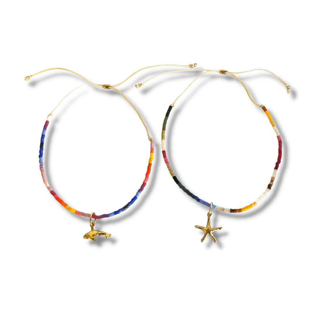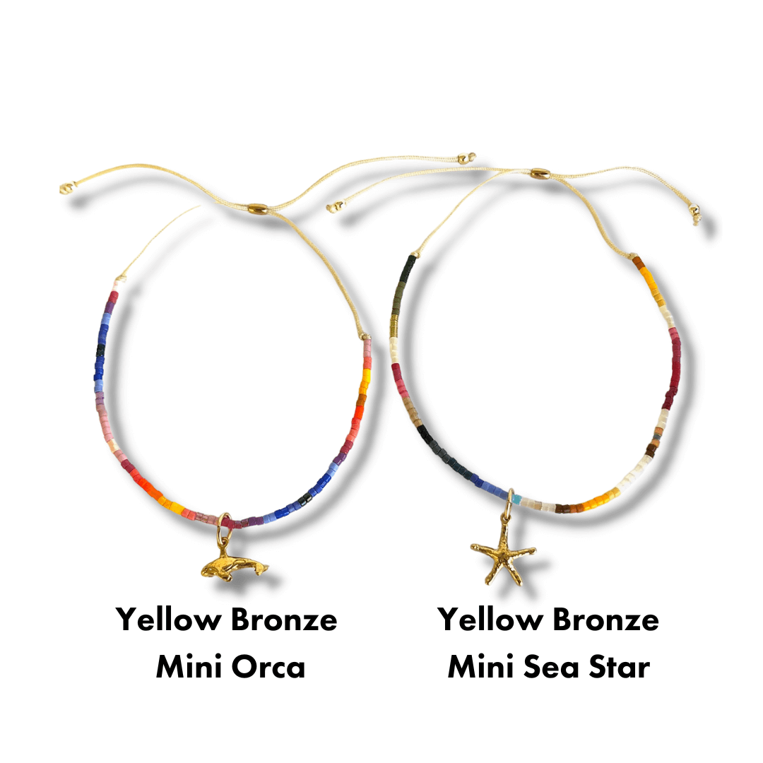 The Yellow Bronze charms are hand made in Anaheim, CA. The shark tooth bronze is made in Thailand. The sand dollar and open wave charms were made in Indonesia. The charms are attached to the glass bead bracelets with 14K gold filled jump rings.
