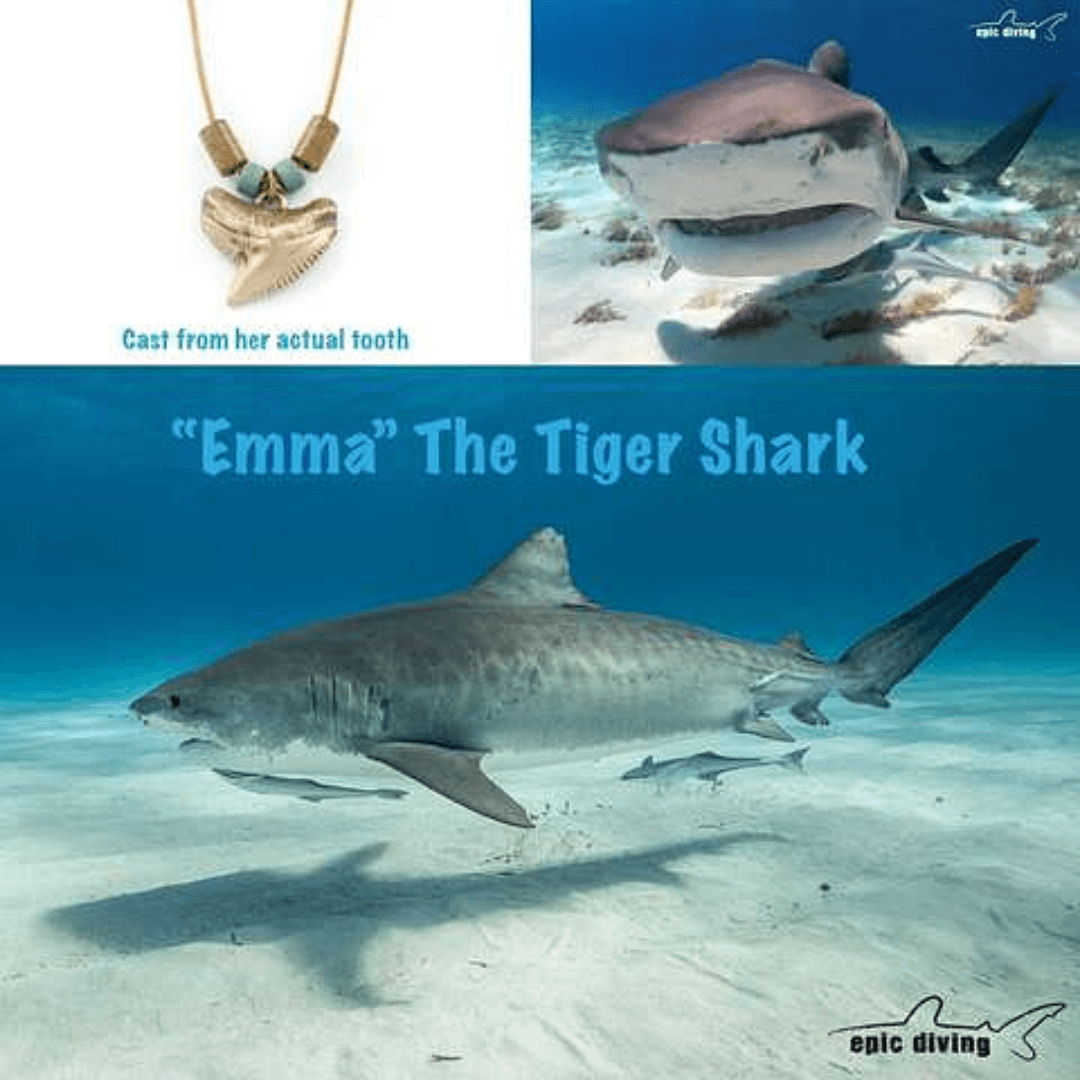 This is a shark tooth replica from the famous tiger shark Emma. She is a resident shark at Tiger Beach in the Bahamas. Emma has been hanging out with divers for years making this the perfect gift idea for your scuba diving friends. Artist Roland St John has hand engraved Emma's name on the reverse side making this an original, unique shark gift for any ocean lover.