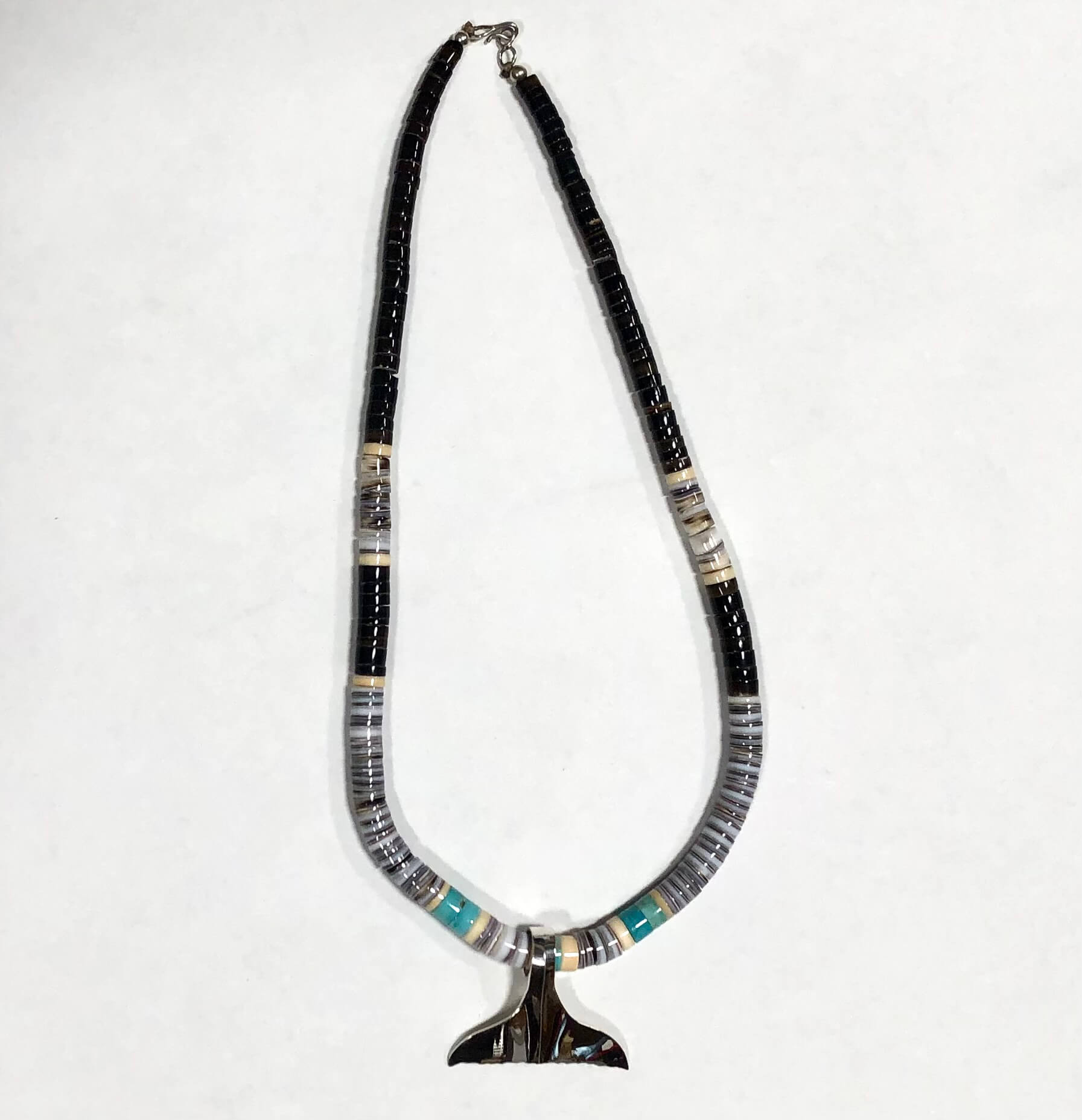 Handmade, this original Heishi (or surfer-style) necklace is one-of-a-kind. All the authentic Heishi shell and turquoise beads used are vintage from the ‘70’s and early 80’s. These vintage shell and turquoise beads have been carefully stored and restrung by an artisan jeweler trained in the native arts. Nothing is newly mined or collected from nature. All are original and genuine turquoise, pen shell, melon shell, and olive shell that were hand-ground 40-50 years ago. The sterling silver hook and eye clasp is a traditional closure for Heishi necklaces.