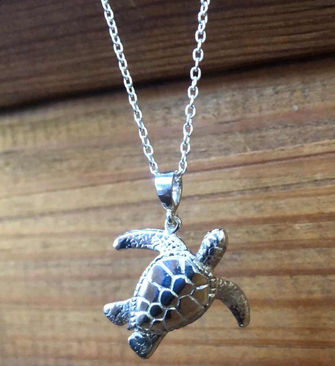Enjoy this exceptional Wyland designed Sea Turtle necklace.  Made of solid sterling silver this ancient mariner measures about one inch. Wyland's sea turtle is designed in an uplifting, swimming posture that Wyland calls "soaring". The design extends to the back side of the piece with textured details along the turtle's under shell.